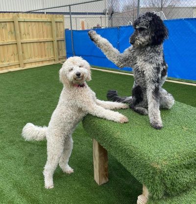 Do you have a dog that loves the water? Well, that's perfect because we have an above ground dock diving pool! We can teach dogs to swim, help get exercise, gain confidence, and if they’re so inclined, we can teach them to dock dive. Puppies in our daycare are exposed to the pool during pool season.
